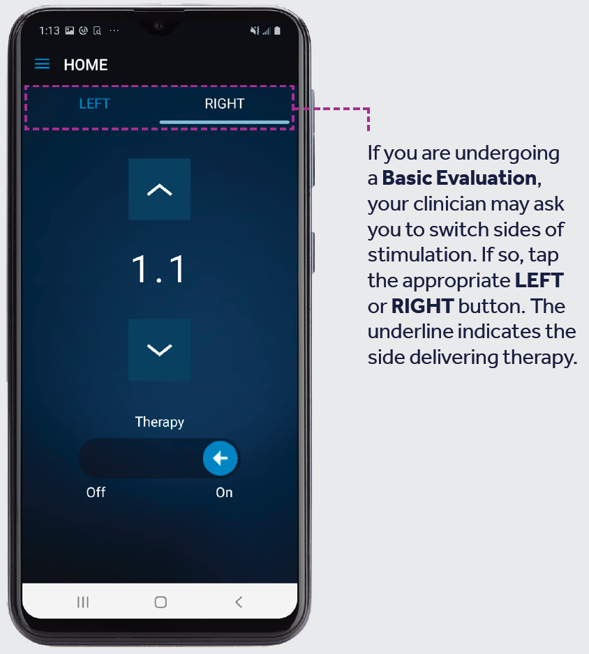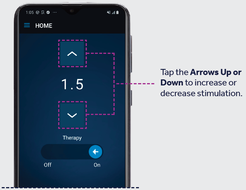 To turn stimulation on, use your finger to swipe the On/Off indicator to the right. To turn stimulation off, use your finger to swipe the On/Off indicator to the left.