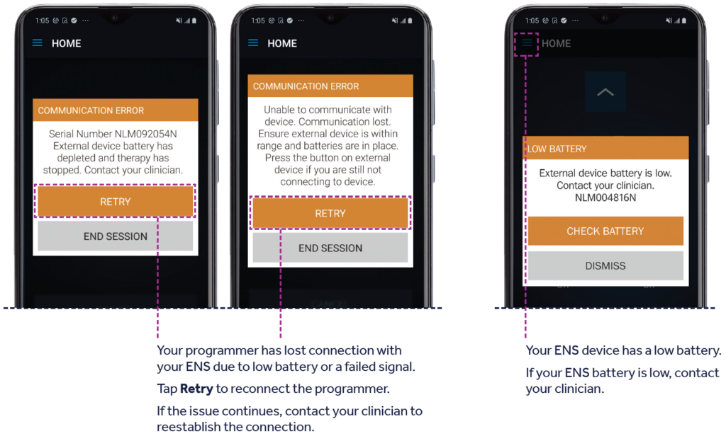 - Your ENS will have new batteries when you go home. The batteries should last for the entire therapy evaluation period. If you receive a low battery alert, contact your doctor.